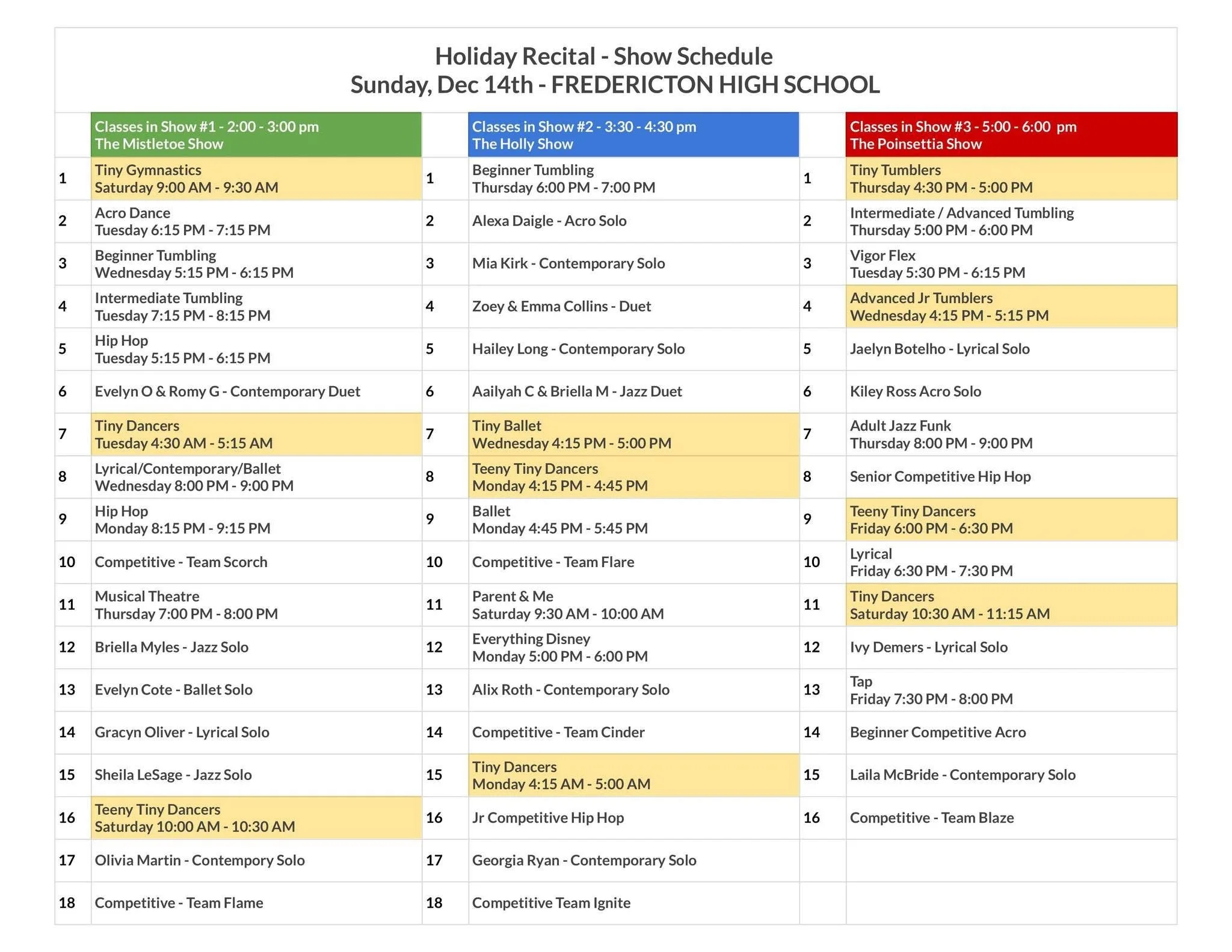 This schedule just lets you know what show time your dancers' class is in. If you have a dancer in more than one class, or multiple dancers in different classes, their dances may be spread across several shows. You do not have to pay for multiple shows, you just buy one ticket and your tickets are good for all the shows